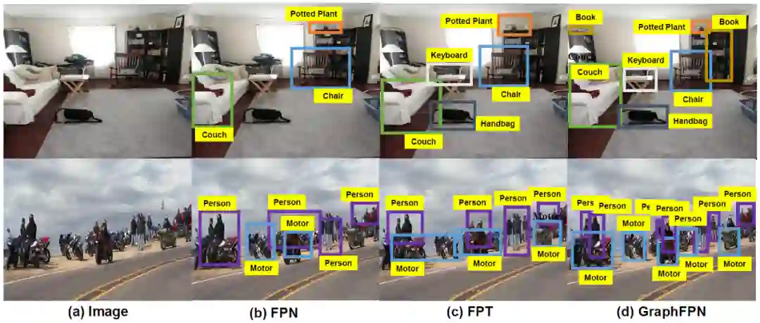 图 3 GraphFPN与FPN和FPT在MS-COCO数据集上的部分检测结果对比