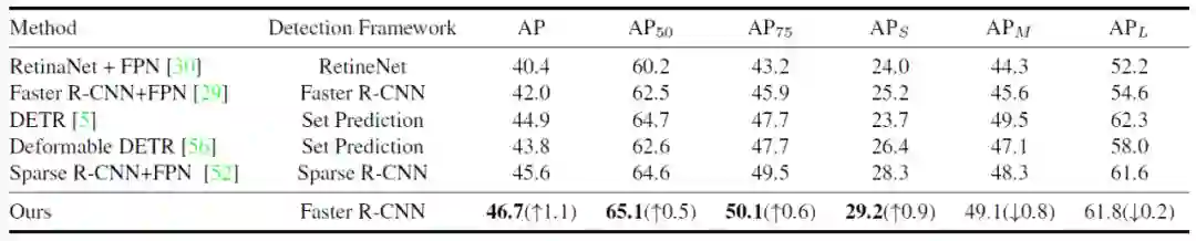 表 2 同当前最新目标检测器在MS-COCO 2017 val set上的比较