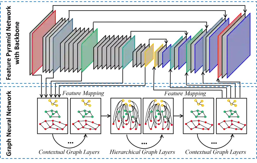 图 1 图特征金字塔网络(GraphFPN)是一个建立在超像素等级上的图神经网络。图特征金字塔网络接受来自卷积主干网络的多尺度特征。这些卷积特征被一种特征映射机制映射到图神经网络的节点中,通过GraphFPN中多个上下文相关层和等级间交互层进行特征融合,最终被反映射回卷积神经网络中进行随后的物体检测。