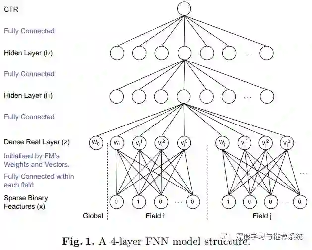 当把深度学习的方法引入到CTR预估中,可谓是百花齐放,这里举一些经典的网络,像16年发表的论文FNN[1],为了避免完全从随机状态训练Embedding,通过FM的隐层向量作为user和item的Embedding,然后再通过隐含层进行全连接也就是特征交叉操作来实现高阶特征的提取,如图(1):