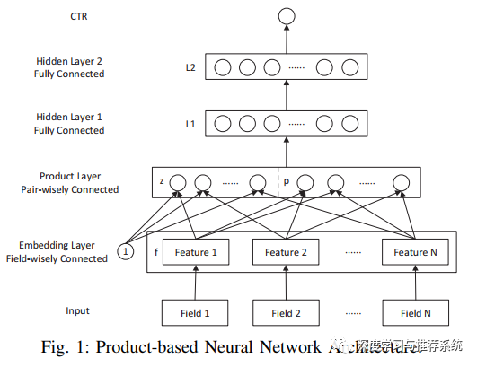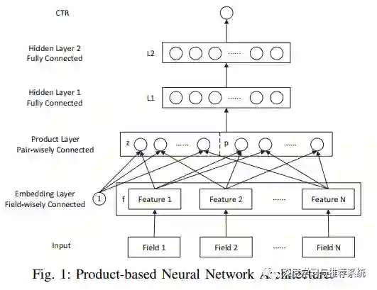 还有在embedding层和全连接层之间加入了Product layer的PNN[2],其product操作在不同特征域之间进行特征组合,随后再加上全连接完成高阶特征的提取。其中product操作又分为inner product,outer product等多种product操作,用来捕捉不同的交叉信息,增强模型的高阶特征提取能力,如图(2):