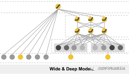 而像Wide&Deep,DeepFM,DCN,NFM这些模型同样也是在高阶特征的提取上下了不少功夫,不同的是这些模型延续Wide&Deep采用两路方式的框架来提取高阶特征,如图(3)为Wide&Deep[3]模型结构,左边是wide部分直接把原始的特征不经过模型处理连接到输出,而右边的deep部分对输入进行多层感知机提取高阶特征之后连接到输出。