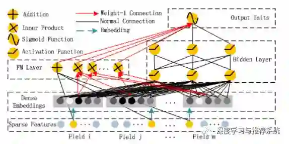 那么接下来看DeepFM是怎样在这个基础上沿着构建更好的高阶特征提取结构的思路上发展的,如图(4)为DeepFM[4]模型结构,可以看出,该模型基本上是把wide部分替换成了FM结构,相当于左边是FM来提取二阶特征,右边是多层感知机提取高阶特征。