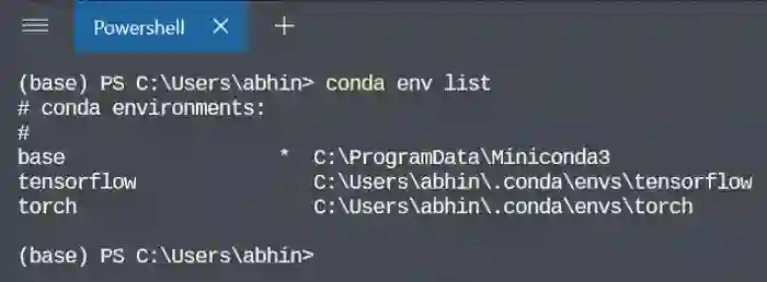 创建 Conda 环境还算简单。为了方便解释,我创建了一个名为 tensorflow 的环境,你可以将其改为任何名称。我将使用 Python 3.7,因为我知道 TensorFlow 对其有很好的支持。顺便一提,这将是安装 TensorFlow 的位置,我还会创建一个名为 torch 的环境来安装 PyTorch。