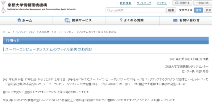 在2021年12月29日,日本京都大学发布公告称,在2021年12月14日至16日间,自己在备份超级计算机系统的过程中,因慧与科技(HPE)推送更新的软件脚本失控被无意中抹去了77TB的研究数据。有14个研究小组的总计3400万个文件被删除,事后有近三分之一的研究小组无法找回他们的数据。京都大学将此次事故的发生完全归咎于HPE的超级计算机系统。