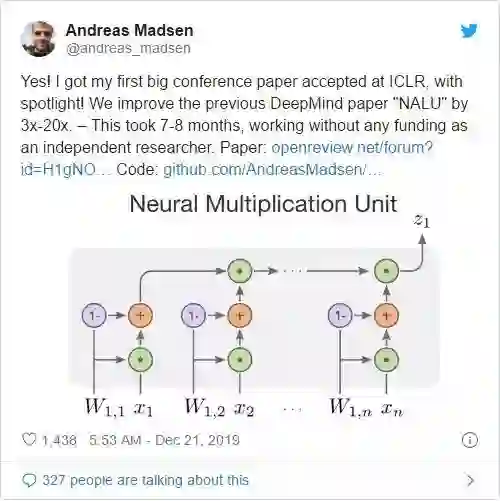 最终,经历了漫长的七八个月没有资助的研究工作后,在 2019 年 12 月,他的论文被ICLR接收。他的工作将 DeepMind 的论文「NALU」中的性能提升了 3-20 倍。
