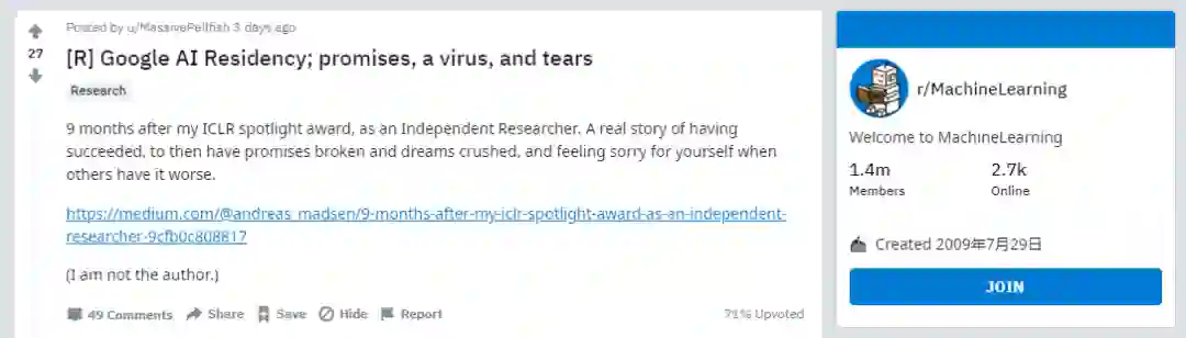 有人将Andreas的文章“9 months after my ICLR spotlight award, as an Independent Researcher”放到了Reddit上,引起了许多网友的围观。