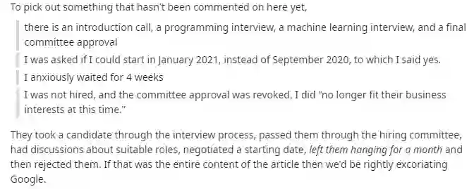 还有网友注意到,Google走完所有的招聘流程,且Andreas也通过了面试,并同意推迟入职时间,却还是让申请者等了一个月,然后发放拒信,是不是有点“不厚道”?