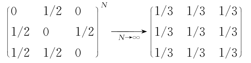 从任何给定的状态出发, 经过N次跳跃后达到各点的概率, 都可以用转移矩阵乘N次求得。 计算虽不难, 但每种具体条件都有其特殊的答案。 然而有一种情形却很简单, 那就是不论从什么状态出发, 经过无穷多次跳跃后, 粒子达到每个点的概率都是1/3。 事实上也很容易证明, 转移矩阵的无穷次方是