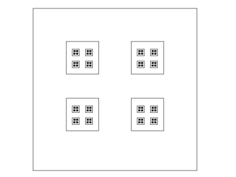 先考虑一类具有自相似性的几何图案。请看图3,其中每个方框内套有四个小方框,如此无限嵌套下去,每个黑点内部还有无穷多同样的结构,而图3本身只不过是更大的方框中的一个小框。整 个图形往大小两个方向无限地重复下去,把它适当地放大或缩小若干倍,都可以和原有图形重合。连续放大两次的效果,也能用一次 放大做到。我们说,这个图案有一个自相似变换群。如果加一条限 制:只许不断缩小尺度,但不准放大,方框小到一定程度就把它抹黑,不再分辨其内部结构。这样就只剩下单方向的自相似变换,这 是一个 “半群”。这里的 “抹黑”,很像统计物理学中的平均,带来了某种不可逆性的味道。