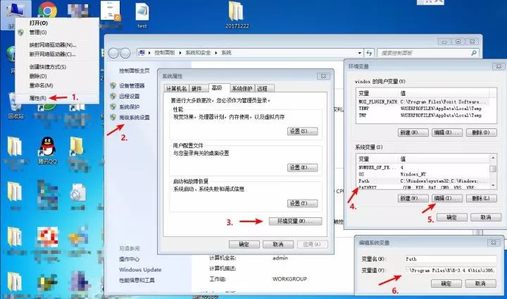 “此电脑”>“属性”>“高级系统设置”>"高级”>“环境变量”>“path">"编辑”
