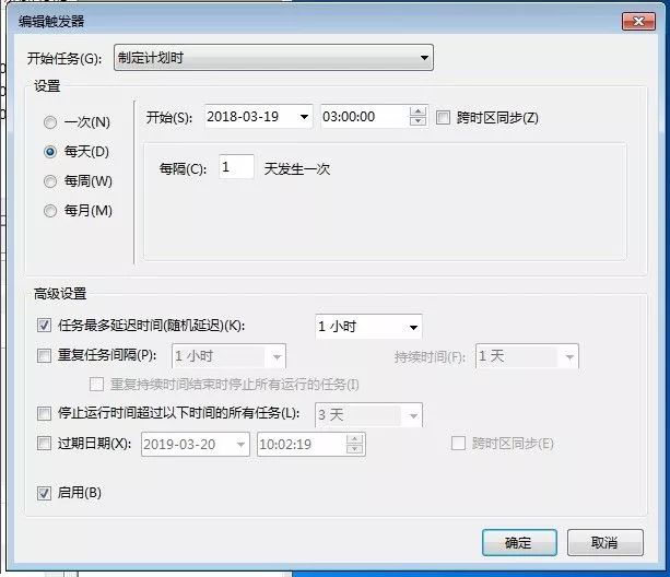设置开始时间,以及间隔。例如:“2018-03-19 03:00:00”、“每隔一天发生一次”。