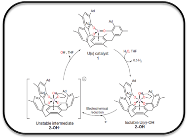 图9. 在均相三价铀[( (Ad, MeArO)3mes)UIII]催化剂下电催化H2O产H2的循环示意图