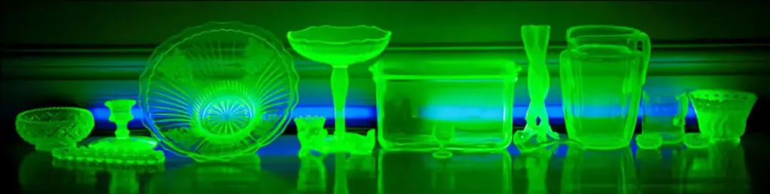 图3. 各种铀玻璃器皿在紫外线黑光下发出荧光(图源:wikiwand.com)