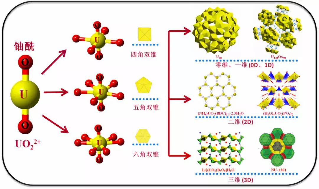 22+的分子轨道是由U的5f/7p/6d轨道与O的2p轨道杂化后形成。其中,U=O键的作用力较强,因此铀酰上的氧表现出一定的化学反应惰性。从而导致六价的铀酰化合物形成独特的配位构型:多角双锥多面体结构。基于其独特的配位构型,具有零维、一维、二维或三维的各种新颖独特的铀酰化合物被层出不穷的报道出来(图8)。