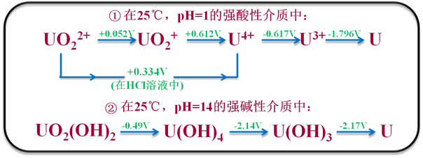 UO22+(黄色),分别对应U(III)、U(IV)、U(V)和U(VI)。其中三价U(III)不稳定, 具有强的还原性;而铀(V)和铀(VI)具有一定的氧化性;同时铀(V)很容易发生歧化反应生成稳定的铀(IV)和铀(VI),而这两种价态也是铀最为常见的两种价态(图7)。