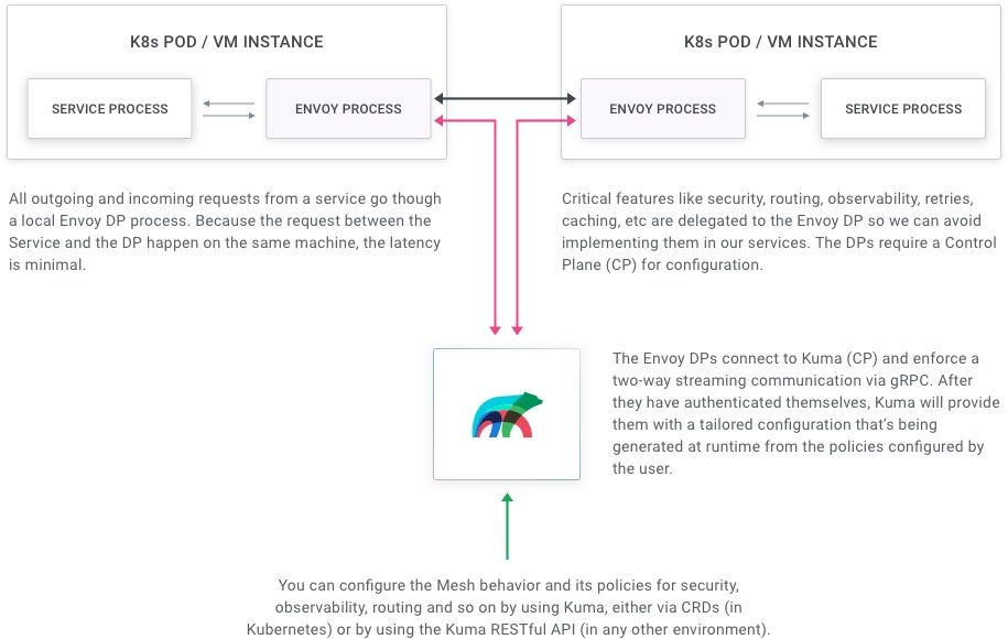 使用 Kuma,我们的主要目标是减少构建可靠的架构所必须编写和维护的代码。因此,Kuma 采用了挎斗代理模型,利用 Envoy 作为其挎斗数据平面技术。