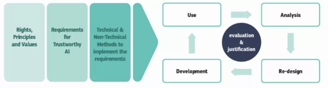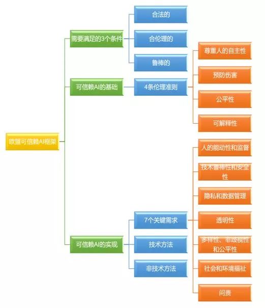 技术方法包括:实现可信赖AI的技术方法覆盖AI系统的设计、开发和使用的全生命周期中,具体包括:构建可信赖AI架构;设计中融入伦理和法律要求;解释方法;测试和验证;服务质量指标。非技术方法包括:监管(管理);行为准则;标准;认证;通过管理框架进行审计;通过教育培养伦理观;利益相关方参与和社会对话;多方参与设计。