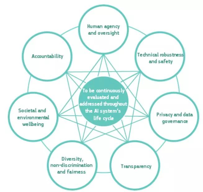 专家组提出了AI系统应该满足的7个关键要素以达到可信赖的要求,分别是:人的能动性和监督(Human agency and oversight),技术鲁棒性和安全性(technical robustness and safety),隐私和数据管理(privacy and data governance),透明性(transparency),多样性、非歧视性和公平性(diversity, non-discrimination and fairness),社会和环境福祉(societal and environmental wellbeing),问责(accountability)。