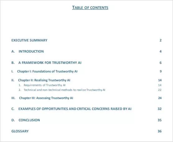 3. 实现可信赖AI的七个关键要素:人的能动性和监督;技术鲁棒性和安全性;隐私和数据管理;透明性;多样性、非歧视性和公平性;社会和环境福祉;问责。