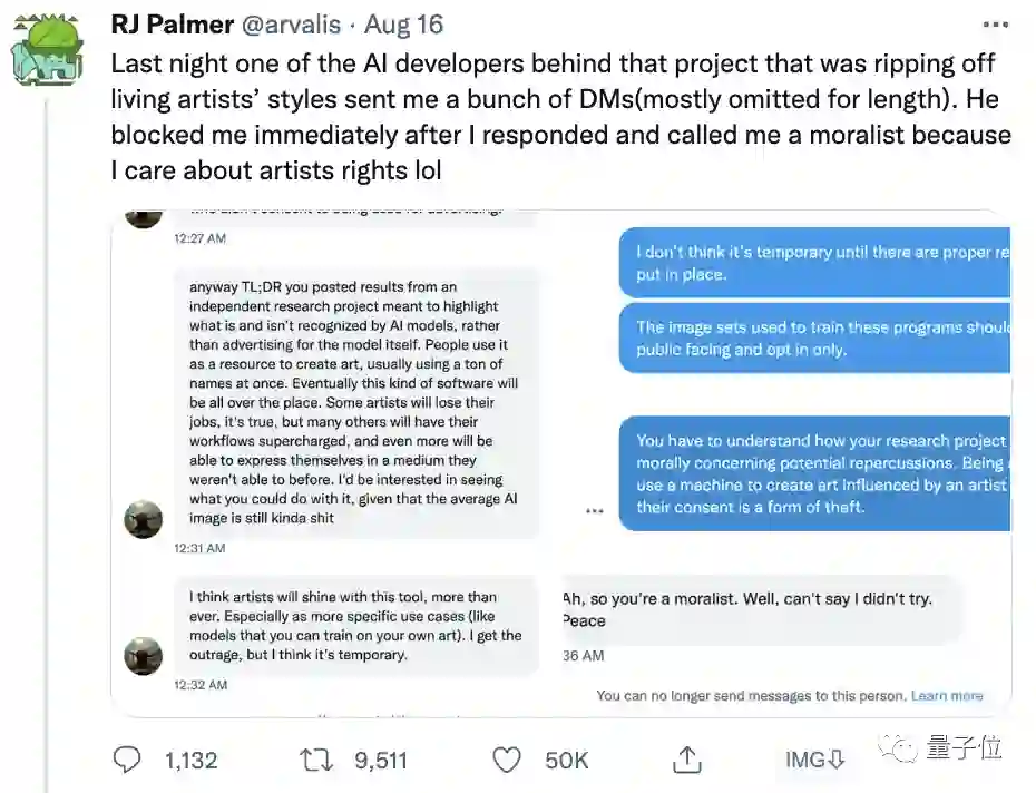 因为Stable Diffusion使用过于泛滥,牵涉到艺术版权的问题,一群艺术家们吵得不可开交,闹到把一个非官方账号举报到了封号。