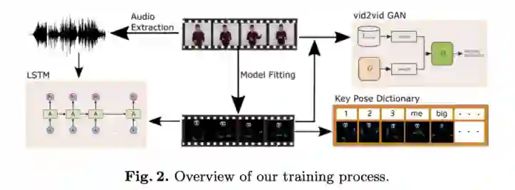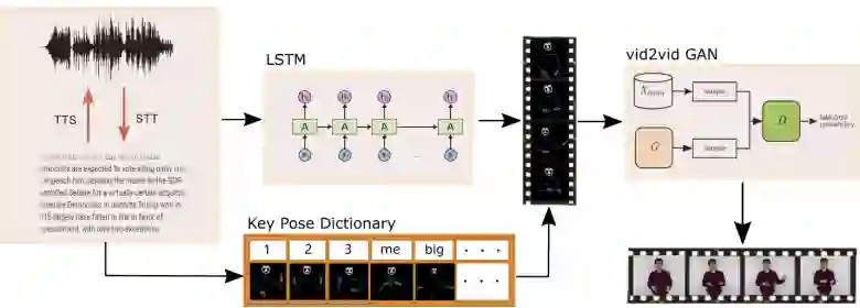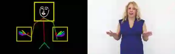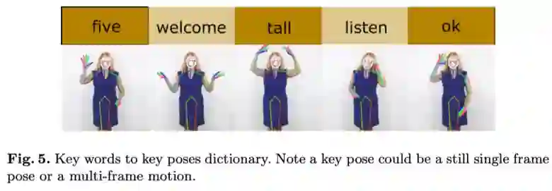 在成功同步语音和动作的同时,LSTM 大部分时间只能学习重复的人类动作,这会使视频看起来很无聊。为了使人体动作更具表现力和变化性,研究者在一些关键词出现时将特定姿势加入 LSTM 的输出动作中,例如,巨大、微小、高、低等。研究者建立了一个字典,将这些关键词映射到它们相应的姿势。