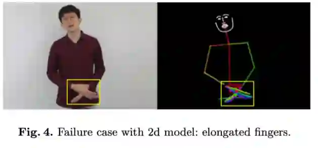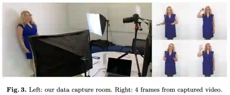 图 3 显示了数据采集环境。模特站在相机和屏幕的前面,当他 / 她在屏幕上阅读脚本时,研究者会捕获这些视频。最后再要求模特摆一些关键词的动作,例如巨大、微小、向上、向下、我、你等等。