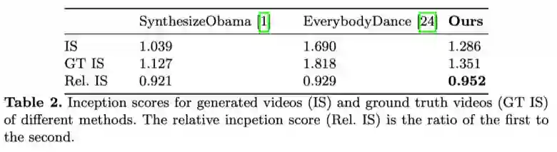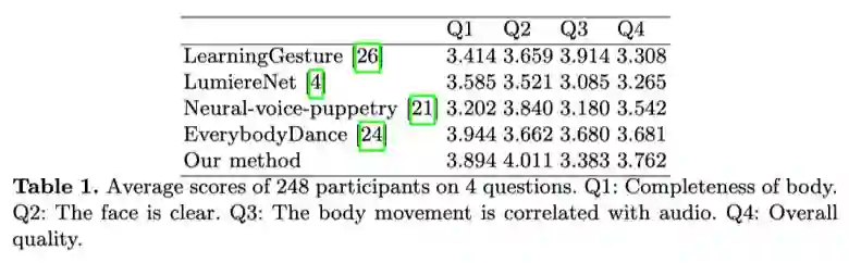 为了评估最终输出的视频,研究者在 Amazon Mechanical Turk(AMT)上进行了人类主观测试,共有 112 名参与者。研究者向参与者展示了总共五个视频,其中四个是合成视频,两个由真实人的音频生成,两个由 TTS 音频生成;剩下的是一个真实人物的短片。参与者以李克特量表(从 1(强烈不同意)到 5(强烈同意))对这些视频的质量进行评分。其中包括:1)人体的完整性(没有遗漏的身体部位或手指);2)视频中人脸清晰;3)视频中的人体动作(手臂,手,身体手势)看起来自然流畅。4)身体的动作和手势与声音同步;5)视频的整体视觉质量。