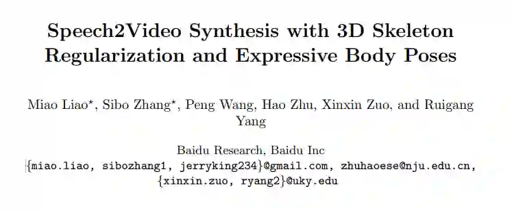 本文来自百度研究院被亚洲计算机视觉会议 ACCV 2020 接收的一篇论文《Speech2Video Synthesis with 3D Skeleton Regularization and Expressive Body Poses》。