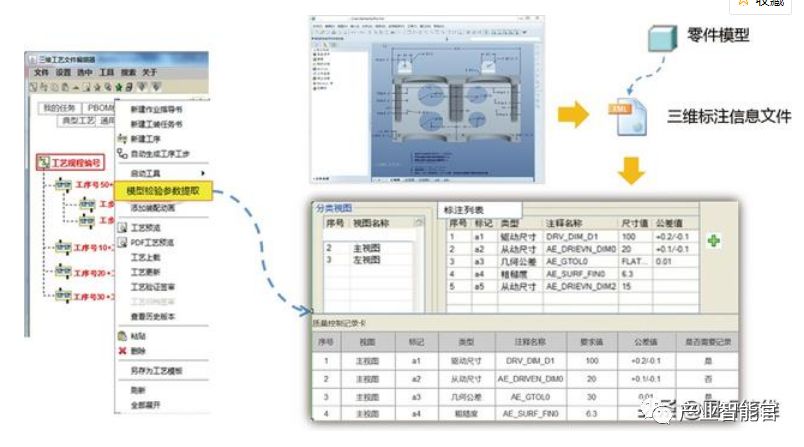 在结构化工艺设计过程中,支持从PDM系统获取MBD模型各视图尺寸标注信息文件进行解析,选择结构化的检验参数,作为车间现场实物检测记录的输入,确保检验尺寸要求信息的准确性。从MBD模型提取的检验参数可以与工艺编辑器可视化区域的三维轻量化模型中的视图与尺寸双向联动,方便工艺工程师的识别