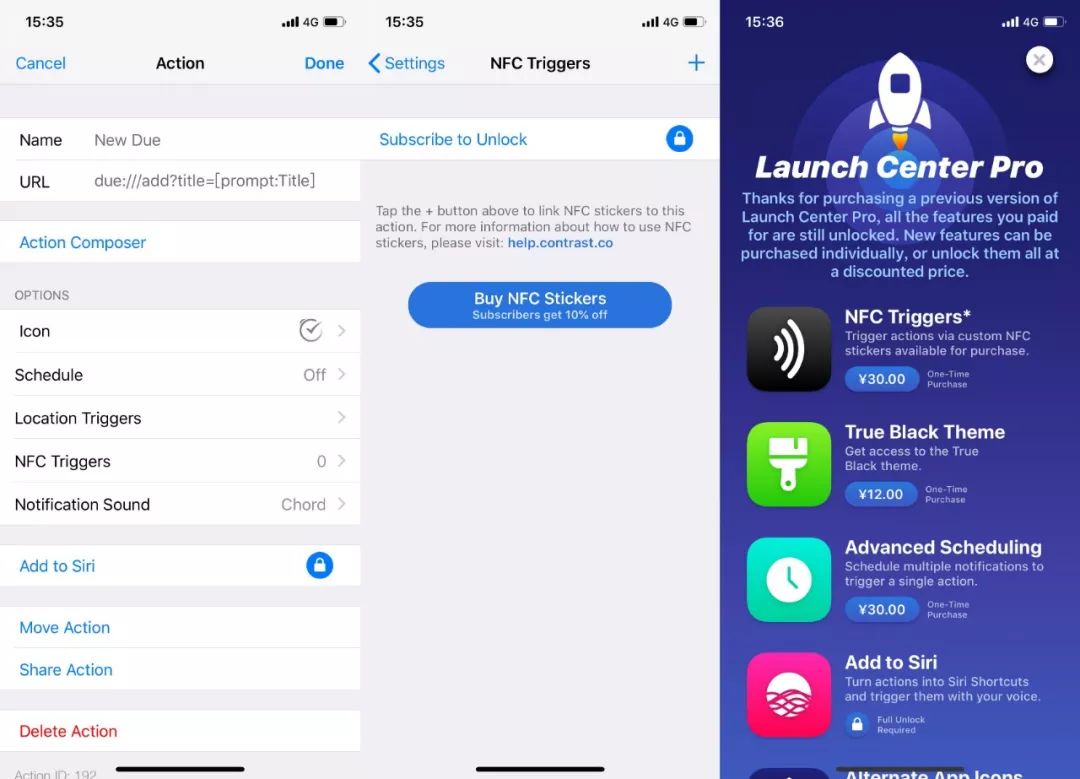 原本 Launch Center Pro 的快速启动,大多依赖于界面按钮、通知栏部件或是 3D Touch 弹出的菜单,而现在你可以通过 NFC 标签感应或是 Siri Shortcuts 启动操作,比如在车上手机架上贴上一个「去单位」的标签,架上手机就会自动开启导航。但是(今天不知道用了多少个「但是」),这些功能你需要支付 70 元 / 年的订阅费或是一次性支付 163 元解锁。Launch Center Pro 能做到的功能,捷径本身基本都可以支持,实在没必要来这里使用语音多此一举。而 NFC 功能的前提是你必须购买独立的 NFC 贴纸与之配合,也并不一定比「嘿,Siri」高效多少。