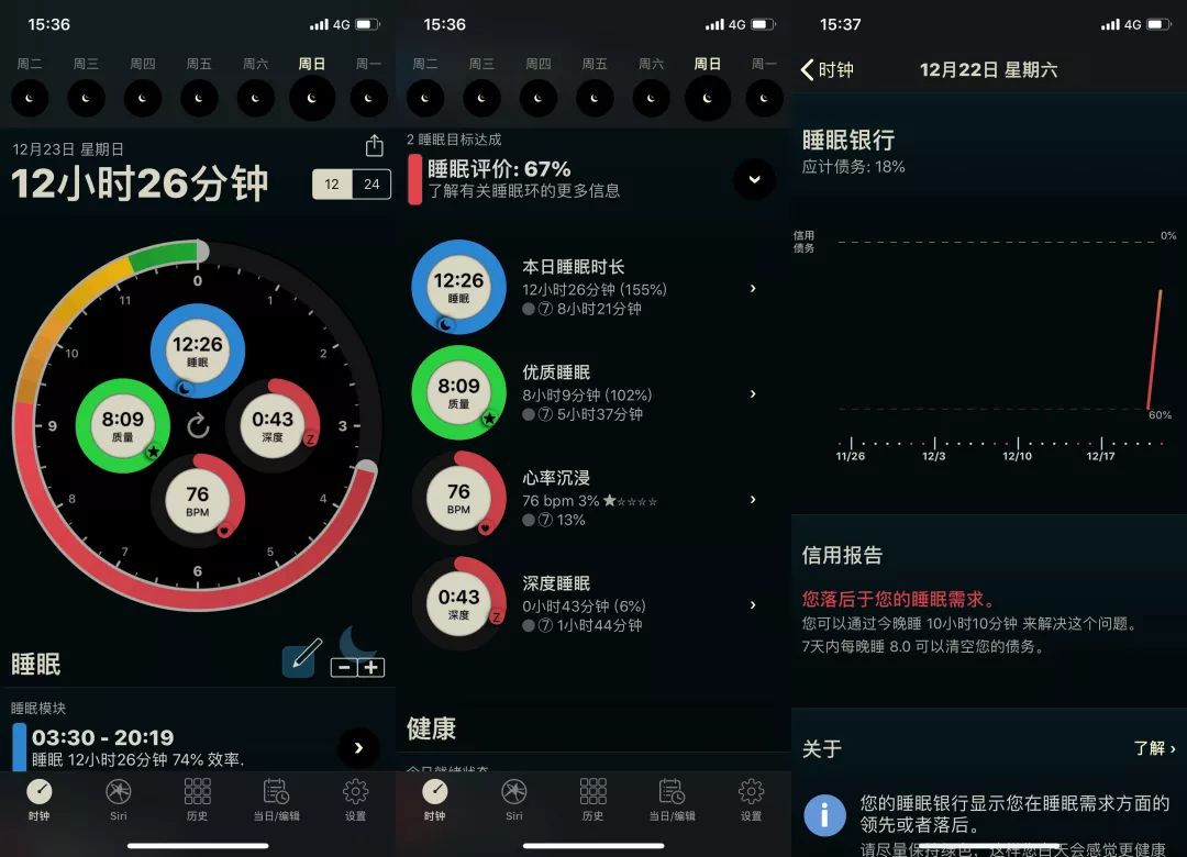 上周更新的 6.0 版进一步对图表展开「优化」工程,原本蓝紫色的睡眠圆环被广为大众接受的彩虹色系取代,由红变绿的趋势线让你能一眼辨析睡眠质量。此外,中间的四个小圈睡眠时长、睡眠质量、心率沉浸以及深度睡眠也给出了更详细的报表,如果你有心改善自己的睡眠,可以点击进入查看折线图了解更多。