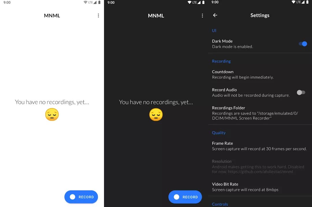 MNML 常被用为 minimal 的缩写,因此 MNML Screen Recorder 这款录屏应用的主推特性自然就是简洁——和市面上大部分免费版功能有限或广告恼人的录屏应用不同,MNML Screen Recorder 这款应用开源免费,有着远远甩开同类应用的界面设计,内建明、暗两套主题,主界面的「录制」按钮甚至还有点 Material Design 2 的味道;功能和上面提到的老牌口碑产品 Screen Recorder 相比虽还有些基础,目前提供的自定义选项包括倒数计时器、录屏存放路径、帧率、比特率和停止录制操作,但这些功能已能胜任大部分屏幕录制任务。