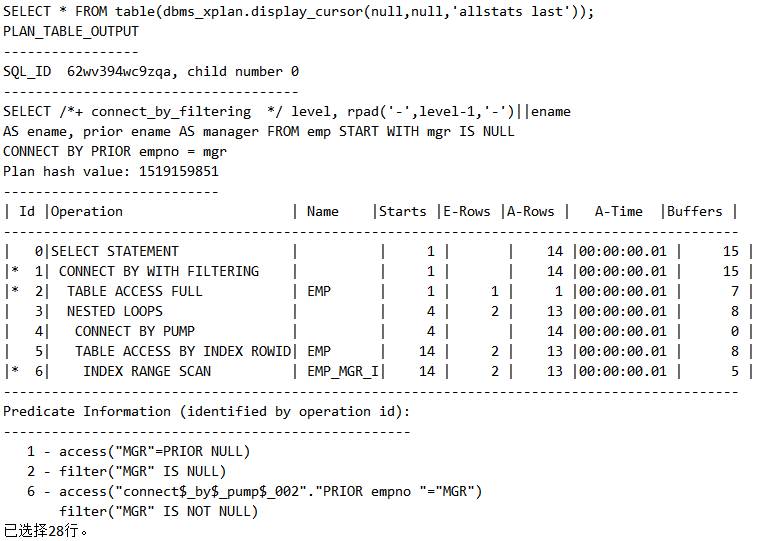 SELECT /*+ connect_by_filtering */ level, rpad('-',level-1,'-')||ename AS ename, prior ename AS manager