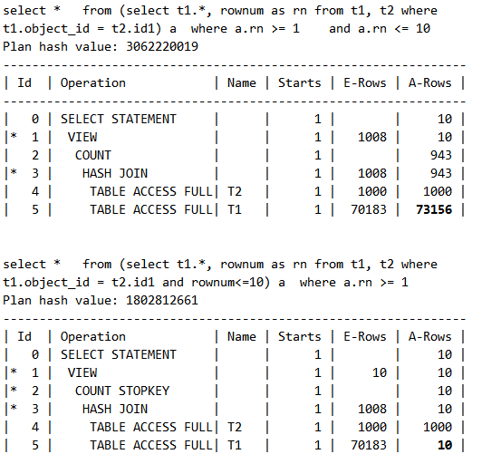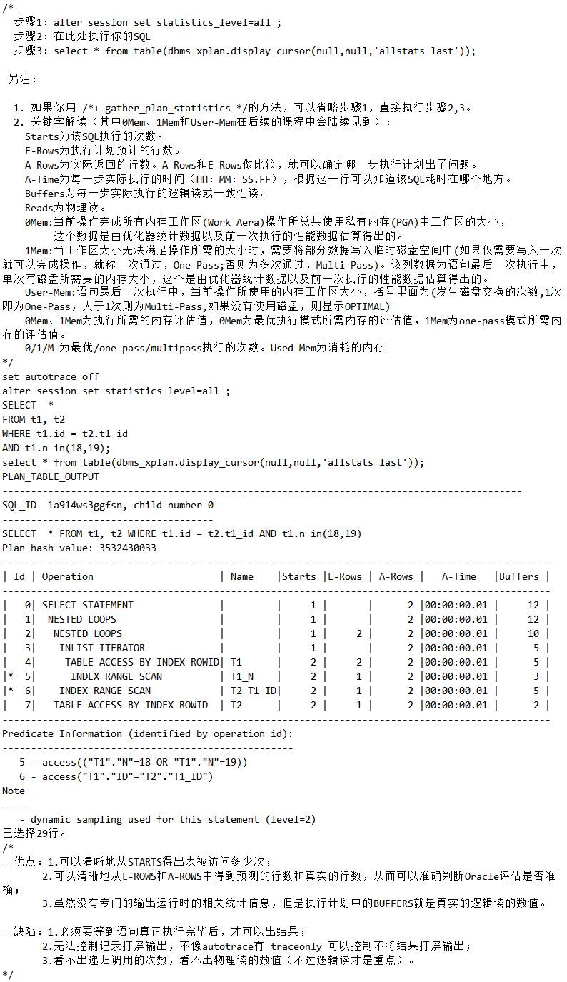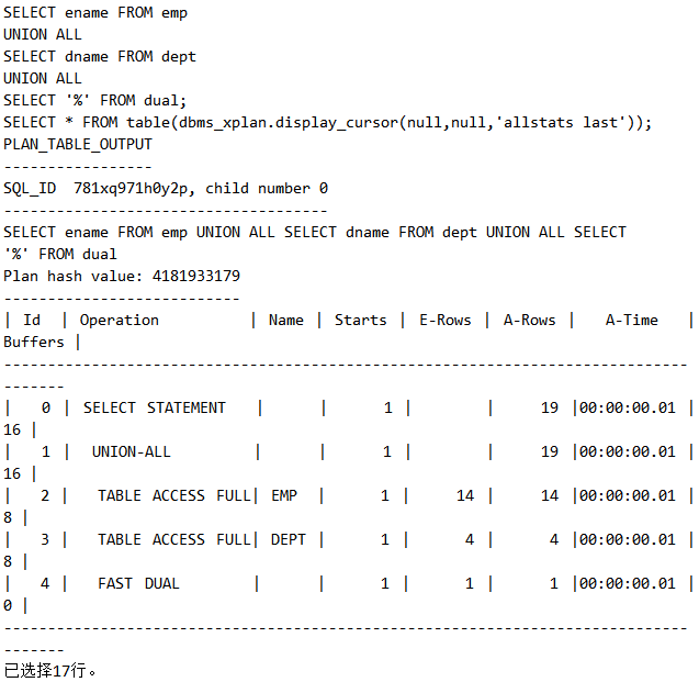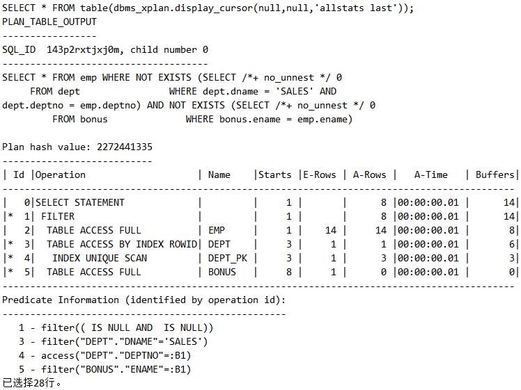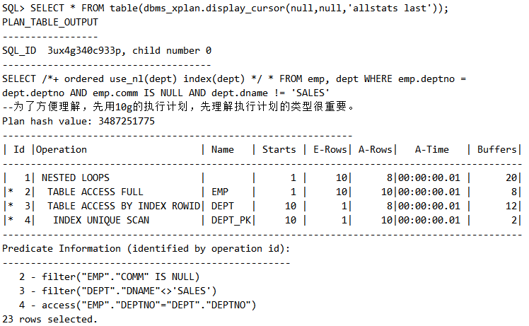 接下来的例子比较经典,请看Id=2和Id=3处,这里显然是联合型,不过我们再观察,Id=2处的A-Rows为10,Id=3处的Starts=10,说明EMP访问的结果集返回多少条,DEPT表就被访问多少次,这是有关联的,这就是联合型的关联型。请回头再看看联合型的非关联型,应该可以明白。