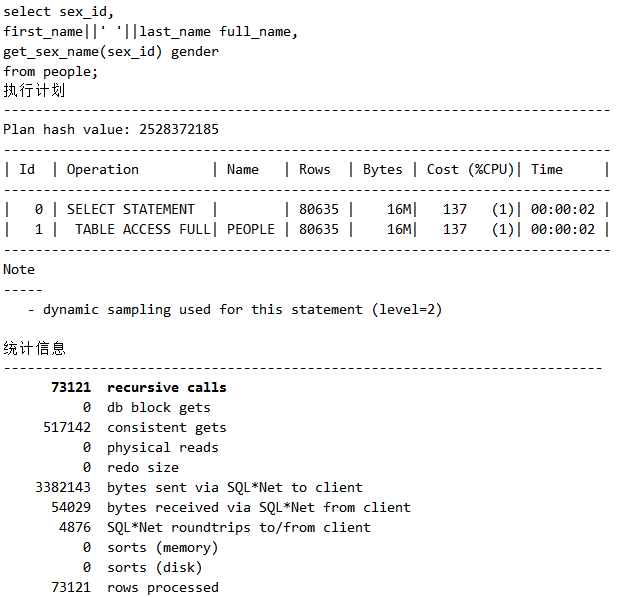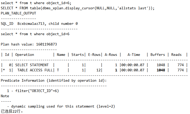 请注意看这个dynamic sampling used for this statement (level=2),这是啥呢?这就是动态采样,当一张表是新建表时,Oracle只好动态地收集这个表的相关信息。然后等到晚上10点,再将其收集到数据字典中。