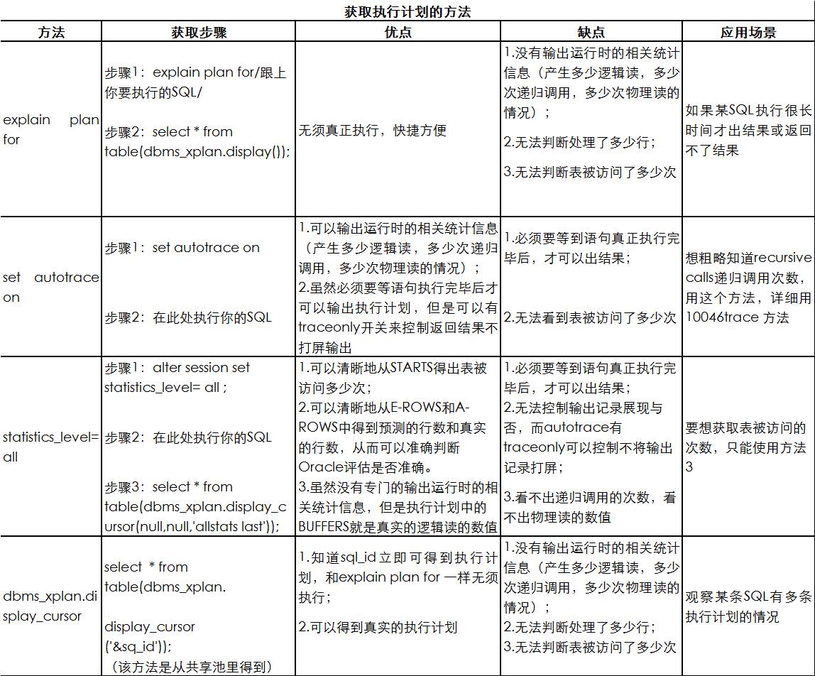 前面大家看到set autotrace on关键字,这是获取执行计划的方法。实际上,在Oracle里获取执行计划的方法有6种。这听起来是不是有些吓人?实际上这些方法各有侧重点,下面一一细看这些方法。