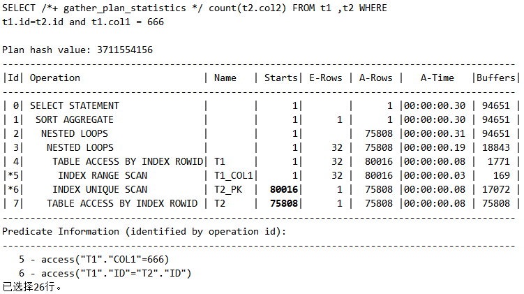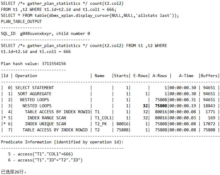 可以看出,t1表比t2表小很多,这时Oracle 就会选择让该SQL的执行计划先访问t1表,再访问t2表。不过问题来了,这Oracle 如何知道这个数据呢?难道也是count(*)一把吗?