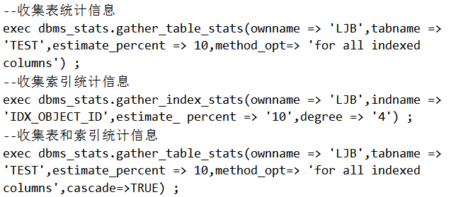 关于收集统计信息的方法比较多,可以是针对整个数据库的收集,可以是针对整个schema的收集,也可以是针对具体某个表和索引的收集。从操作实用性来看,主要的日常操作都是手动收集某表或者某索引的统计信息,方法如下: