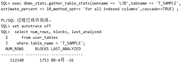 构造环境,新建一张T_SAMPLE表,发现统计信息果然没有被收集,对应的NUM_ROWS BLOCKS和LAST_ANALYZED都是空的。