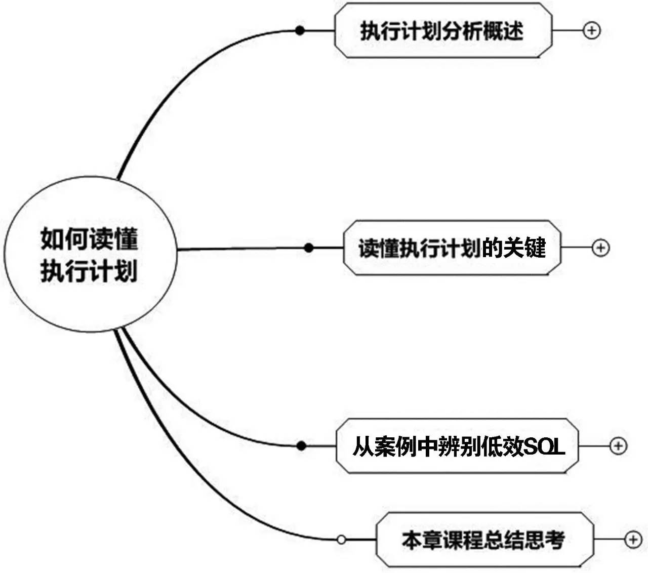 执行计划是什么?如何读懂执行计划?读懂执行计划对我们又有什么用?面对这些疑问,我们从执行计划分析概述、读懂执行计划的关键、从案例中辨别低效SQL、总结思考这四部分入手开始本章的学习分享,如下图所示: