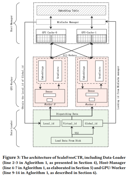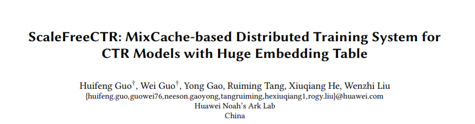 本文将介绍华为诺亚推荐搜索与AI系统工程联合团队最新发表在SIGIR2021上的研究成果:ScaleFreeCTR: MixCache-based Distributed Training System for CTR Models with Huge Embedding Table。ScaleFreeCTR针对超大规模Embedding的深度推荐模型,提出CPU-GPU协同训练系统,通过自研的MixCache缓存机制和高效的流水线设计,实现CPU-GPU数据传输延迟的降低,提升了并行效率。同等硬件下,训练性能超过HugeCTR的5倍,目前已在华为多个业务场景中应用,ScaleFreeCTR近期将在华为深度学习框架MindSpore进行开源。