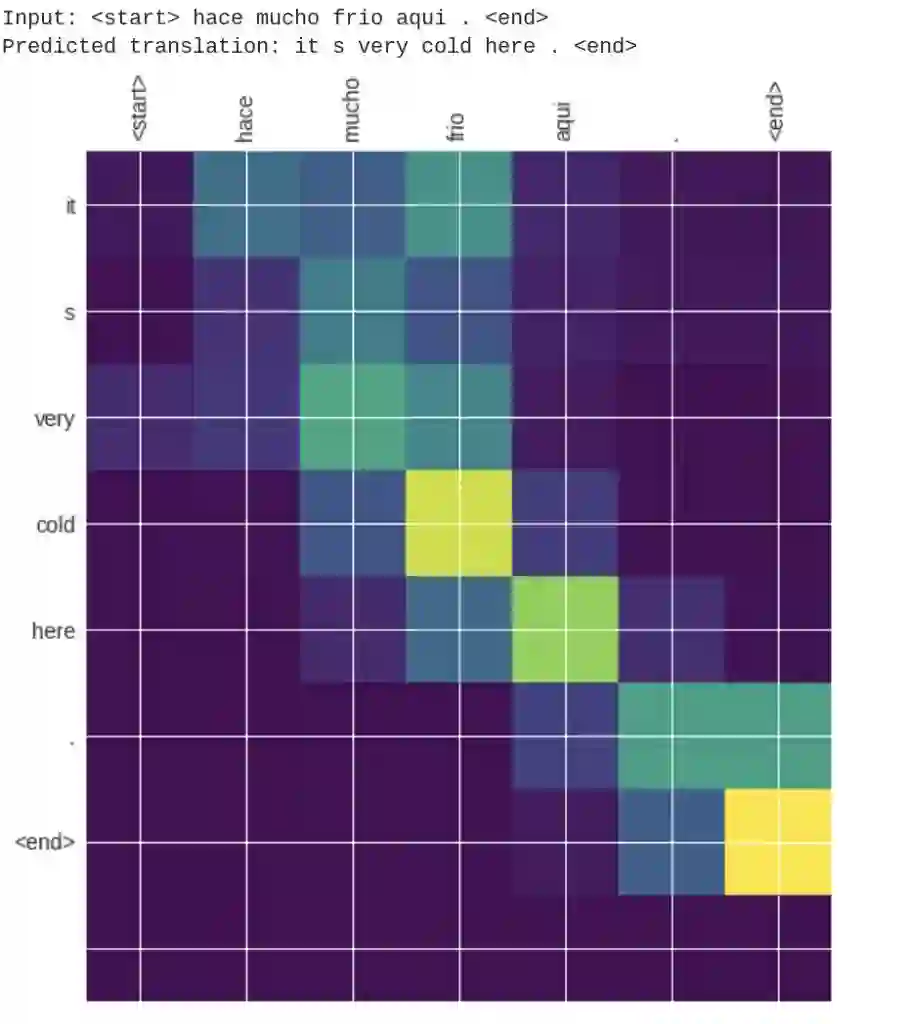 下图是注意力图。它显示了翻译时,输入句子的哪些部分会引起模型的注意。例如,当模型翻译「cold」这个词时,它正看着「mucho」,「frio」,「aqui」。我们使用 tf.keras 和 eager execution 从零开始实现 Bahdanau Attention,详细解释在 notebook 中。你还可以将此实现用作实现自定义模型的基础。
