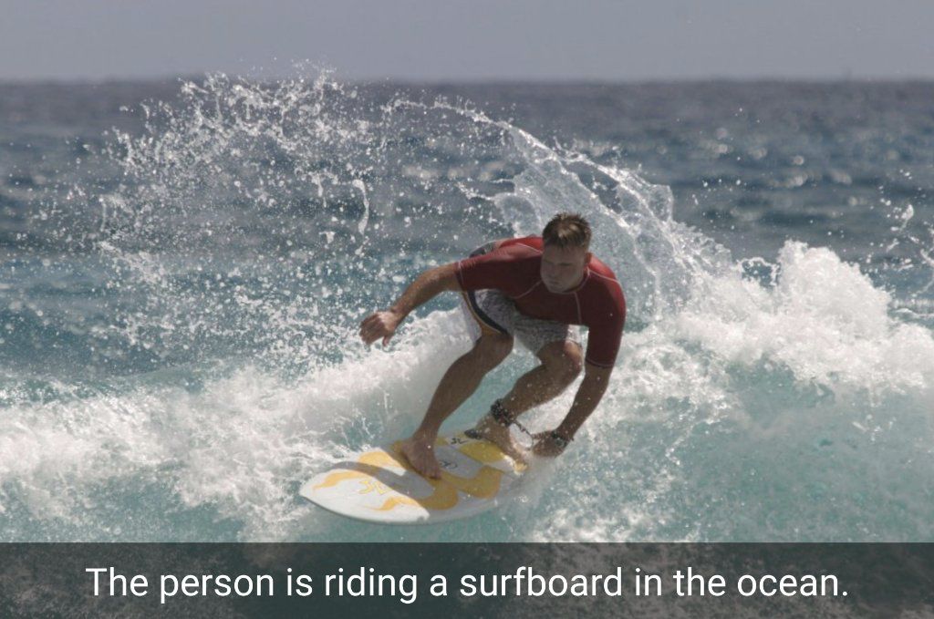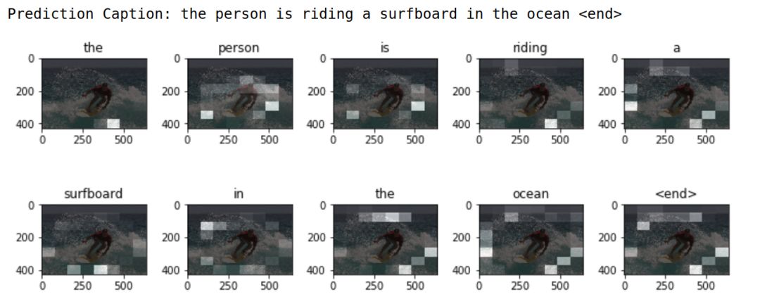 在此示例中,我们训练模型用以预测图像的标题。我们还生成了一个注意力图,它显示了模型在生成标题时所关注的图像部分。例如,当模型预测单词「冲浪板」时,它会聚焦在图片中的冲浪板附近。我们使用 MS-COCO 数据集的子集训练该模型,该数据集将由 notebook 自动下载。