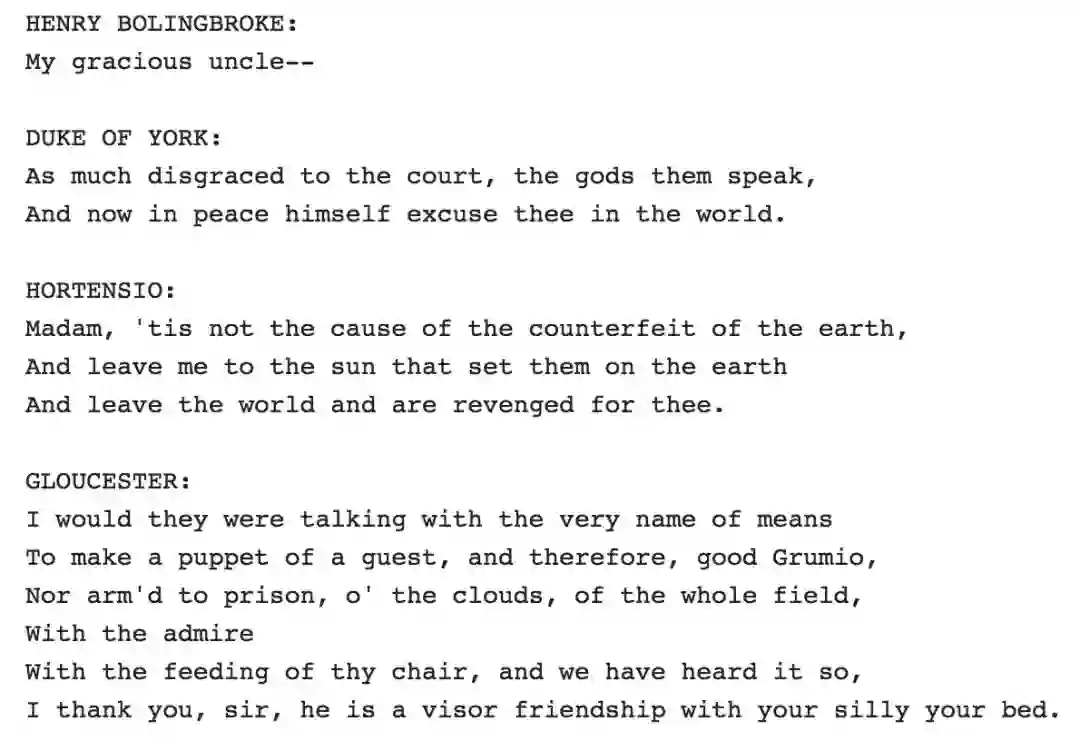虽然大部分句子都没有意义(因为这个简单的模型还没有学会语言的含义),但令人印象深刻的是,大多数单词拼写正确,并且它生成的剧本结构看起来与原始剧本的结构相似。(这是一个基于字符的模型,我们训练它的时间不长——但它已经成功地从零开始学会了这两件事)。只要你想,更改一行代码就可以更改数据集。)