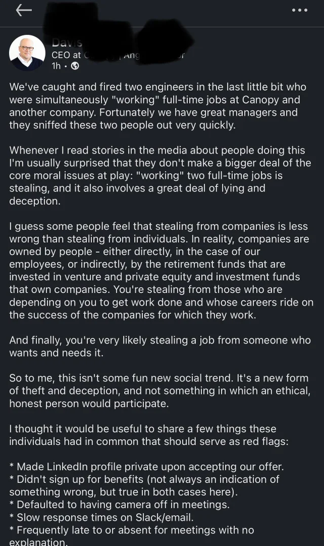 我们抓到并解雇了两名最近雇用的工程师,他们来到我们这里进行「工作」时并未离开他们在另一家大型技术公司的上一份工作。他们正在使用一种新的工作趋势,即找到第二份全职工作,同时向两个雇主撒谎。这不是一个副业或兼职的案例,这些人从事着两份同步的全职工作,并且对此撒谎,试图同时参加两个会议等等。他们早期的表现真的很糟糕,幸运的是我们有很棒的经理,很快就发现了他们的问题。