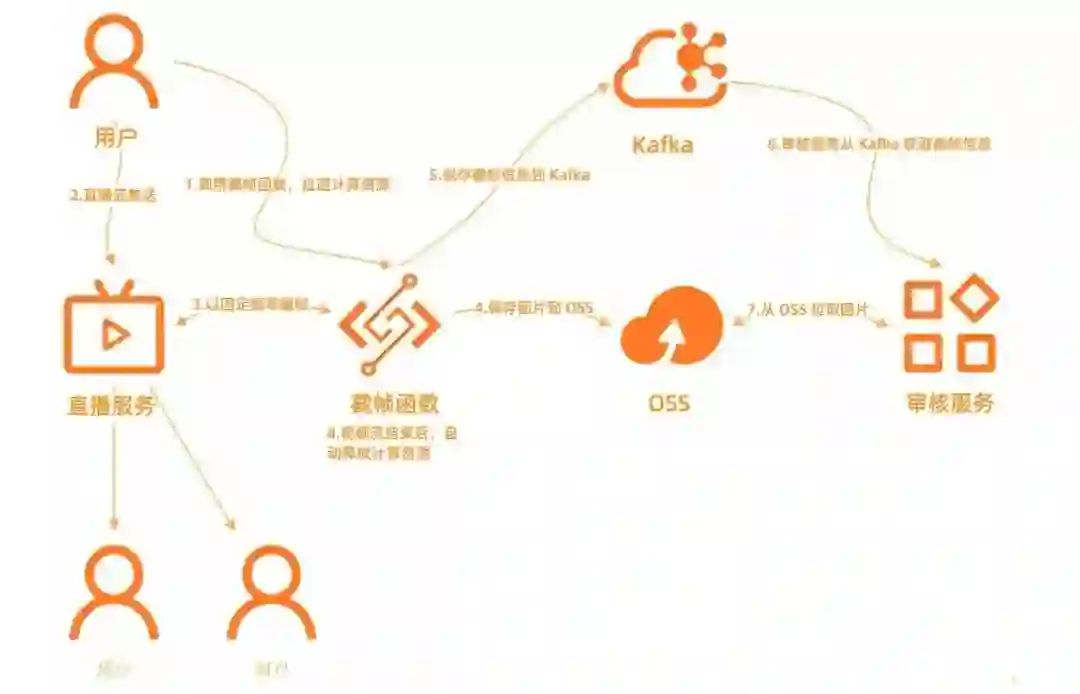 在这个需求里面,截帧服务承担着关键职责,这个服务不仅需要通过 FFmpeg 命令对每一路直播视频流进行截帧操作,还需要将生成的图片保存到对象存储 OSS,并将截帧信息写入到 Kafka。这样下游的截帧服务就能从 Kafka 上拉取截帧信息,并从截帧信息中得到图片在 OSS 中的地址,从而完成对于图片的审核。在这个架构中,引入 Kafka 是为了通过异步处理机制缓解审核服务在业务高峰期的负载。