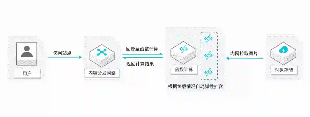 某微博使用函数计算的弹性扩容、事件触发、按量付费的特性部署图片处理业务,将用户上传的图片存储到对象存储中,编写函数实现个性化的图片处理。当微博的用户通过客户端获取图片时,请求通过阿里云CDN回源到函数计算,函数从对象存储中下载原图,根据客户端类型(比如不同的手机型号)实时处理成预期规格的图片,并将结果图片返回, 极大减少存储成本。