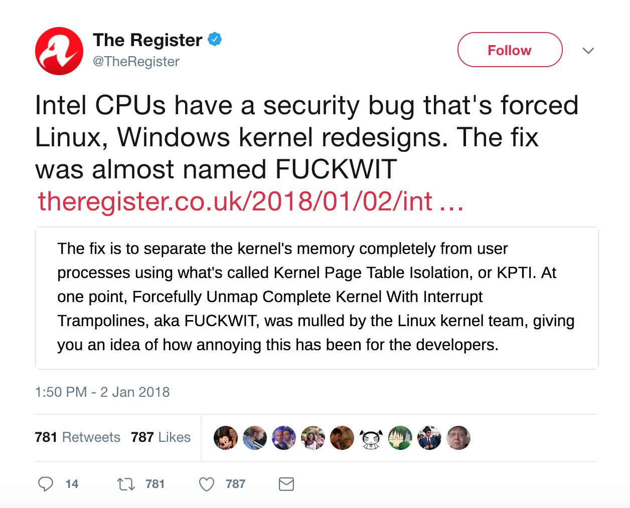 据 TheRegister 报道, Intel 处理器芯片近日披露的一项设计 BUG ,已经迫使 Linux 和 Windows 内核紧急重新设计,以解决芯片级的安全漏洞。此外,苹果的 64 位 macOS 等类似的系统也需要进行更新。该问题存在于 Intel 的 x86 硬件之中,且似乎无法通过微码升级来解决,必须要在系统层面通过软件来解决,或者购买没有设计缺陷的新处理器。