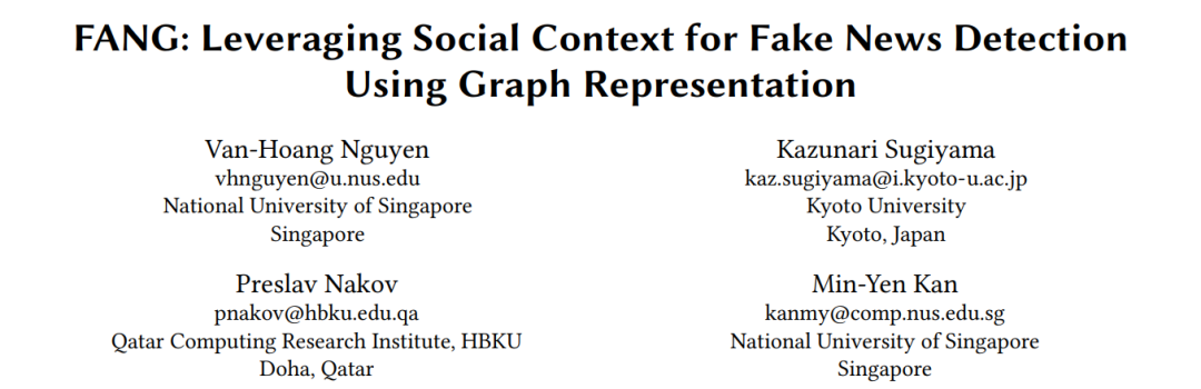 1、一作新加坡国立大学的《FANG: Leveraging Social Context for Fake News Detection Using Graph Representation》,